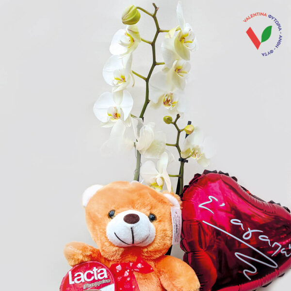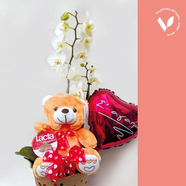 Γλάστρα Ορχιδέας σε Χάρτινο Κασπώ με Αρκουδάκι κ Μπαλόνι