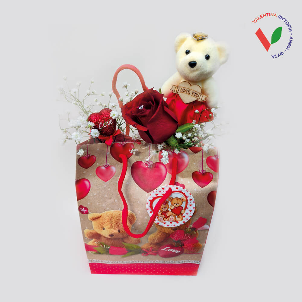 Πλαστικοποιημένη σακούλα δώρου 30cm με Τριαντάφυλλο stick αρκουδάκι κ ιριδίζων καρδιά