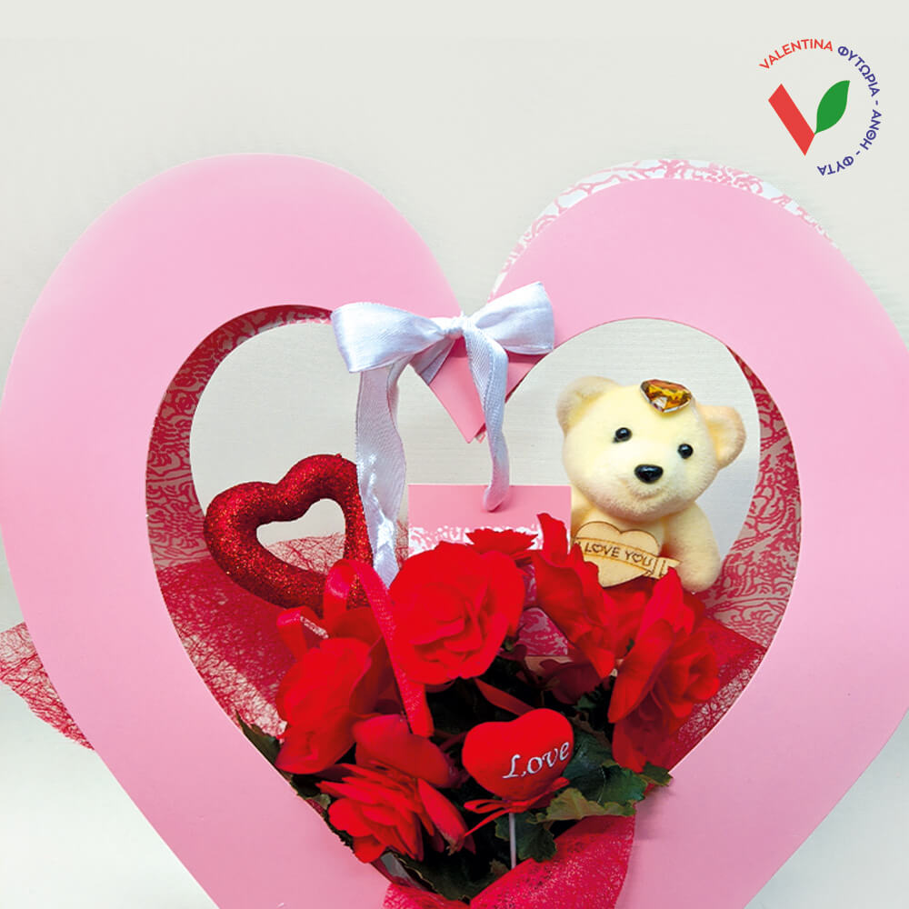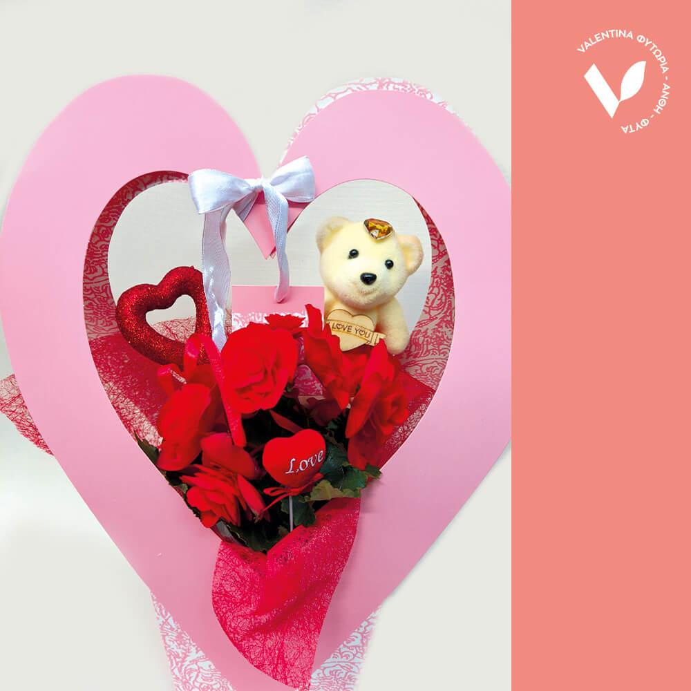 Χάρτινο Κασπώ Καρδιάς με γλάστρακι Μπιγκόνιας stick αρκουδάκι κ ιριδίζων καρδιά